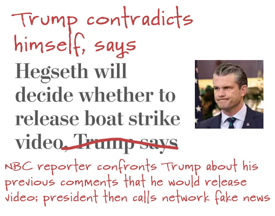 The Washington Post doesn’t get a pass here just becauses it eventually includes context in the subhead for its December 8 story about President Trump’s flip-flop on his statement last week that he would release video of a military strike on a civilian boat in international waters, an act that legal experts are calling murder.