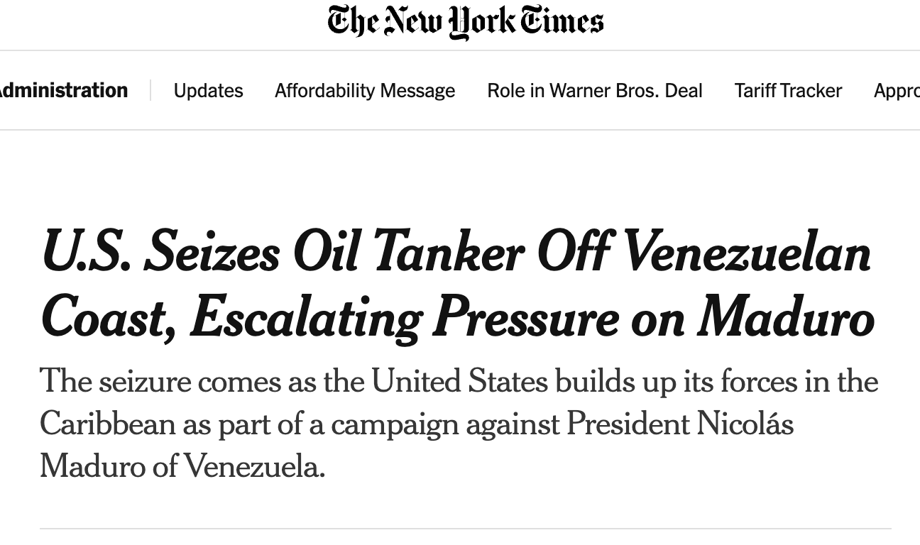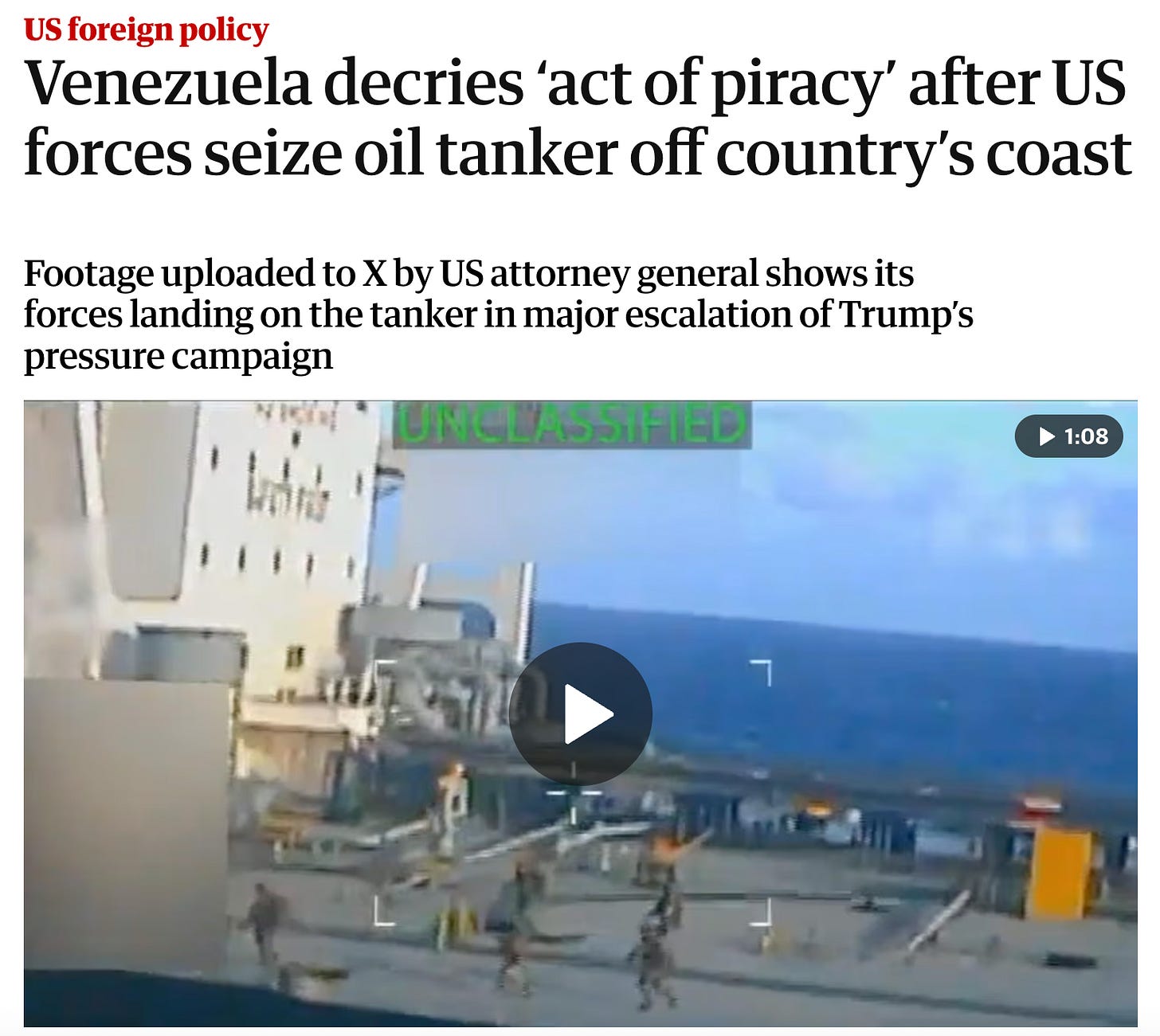 The Guardian headline shows the effect of the seizure — providing the victims an opportunity to respond to an unprovoked act — and notes importantly where the seizure occurred: off Venezuela’s coast.