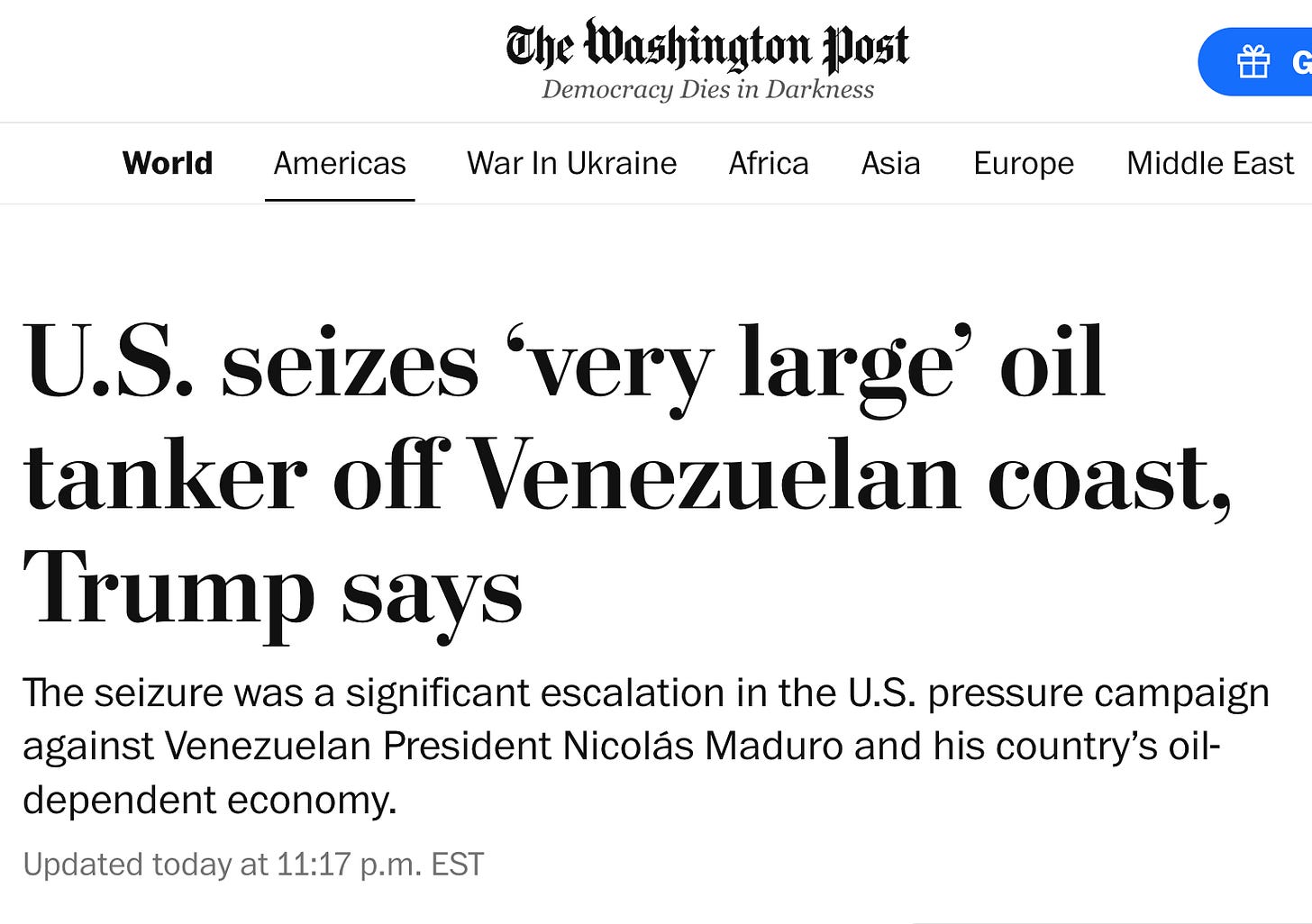 To be fair, this was a headline for a follow story a few hours after the Guardian’s first story on the seizure. However, neither the Post nor Times wrote such a follow story that I could find on their websites focusing on the Venezuelan claims of piracy.